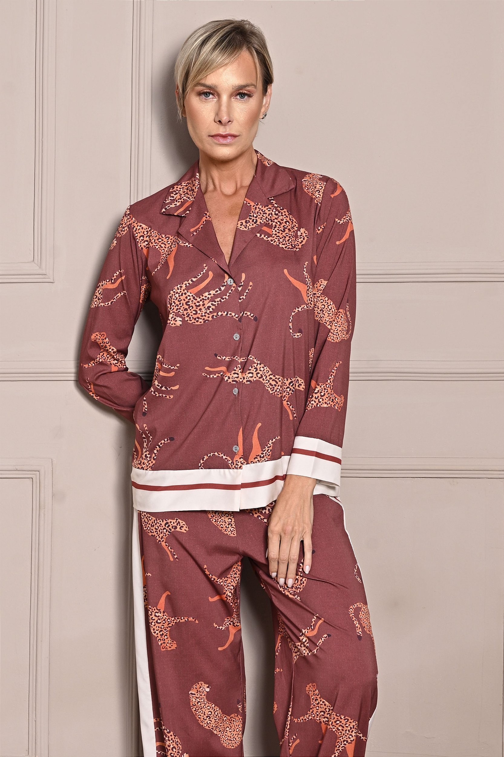 O mix entre a estampa de leopardo marrom e as listras estrategicamente colocadas nos punhos e barras da blusa e laterais da calça tornam o conjunto super moderno e com um ar esportivo também, por isso use tanto com tênis como com salto alto.