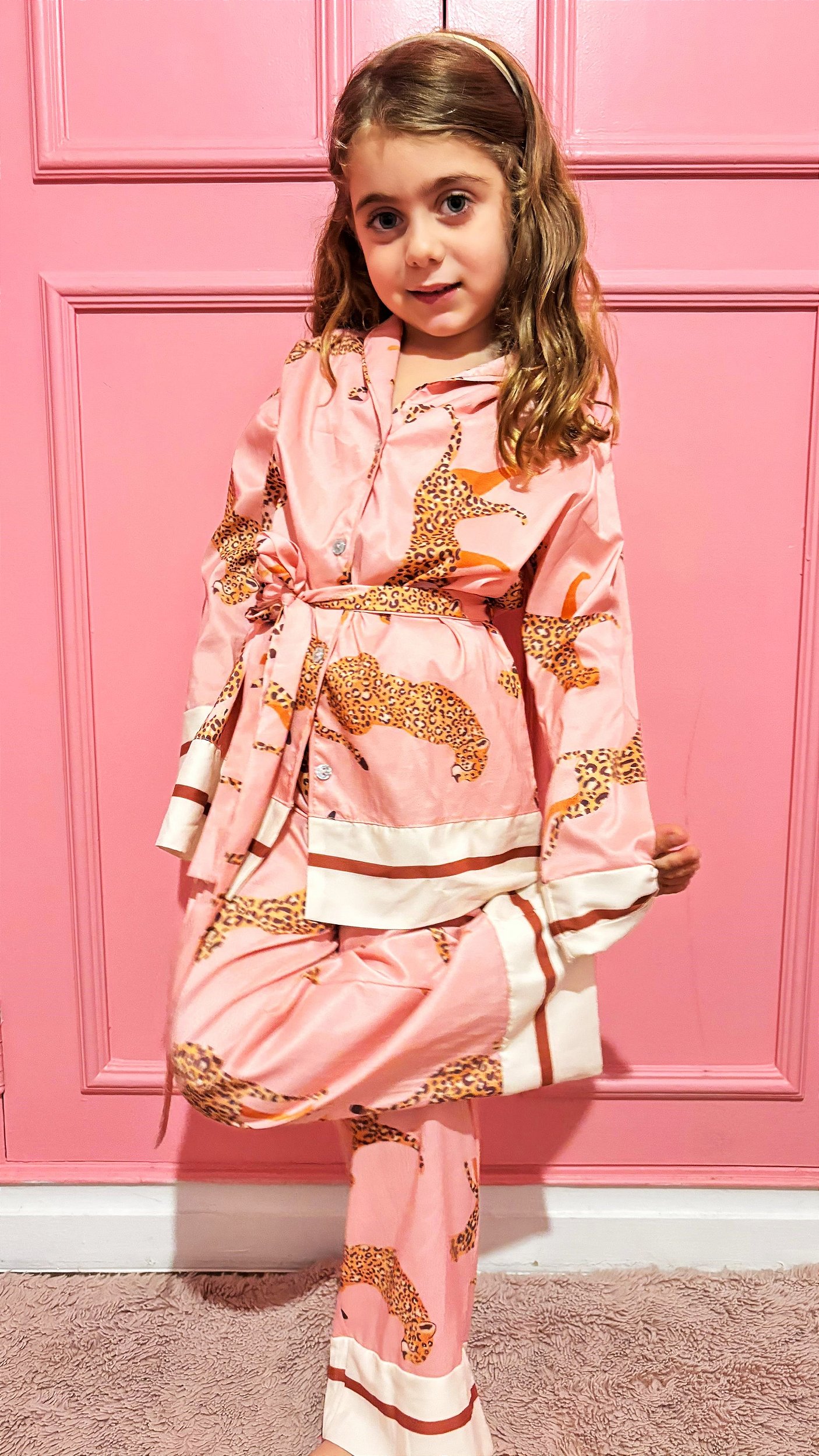 O mix entre a estampa de leopardo rosa e as listras estrategicamente colocadas nos punhos e barras tornam o conjunto super moderno e com um ar esportivo também, podendo ser usado de tênis ou sapatilha.